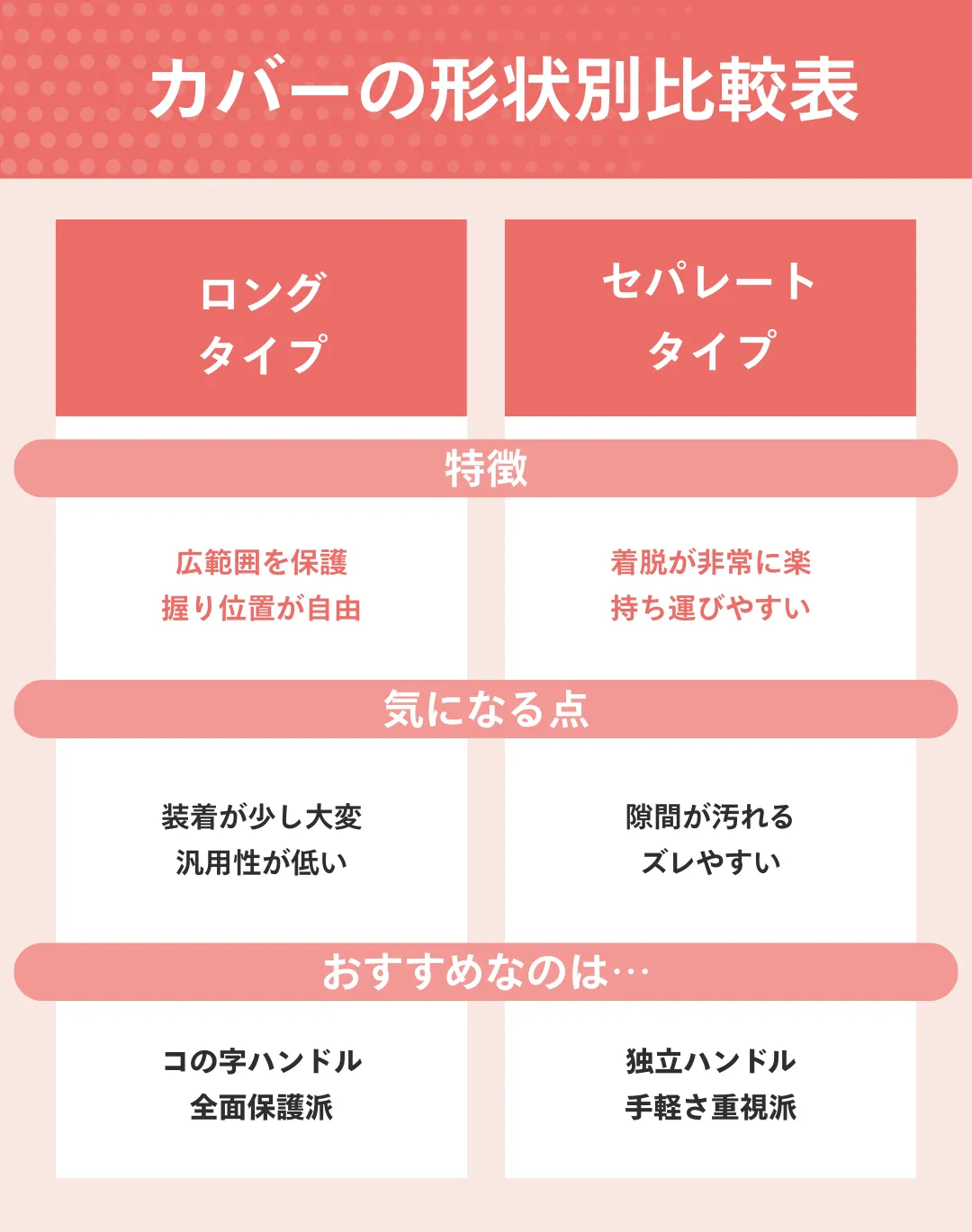 左右が一体となっているコの字型のハンドルには、長い1枚の生地で覆うロングタイプのカバーが適しています。中央部分まで隙間なく保護できるため、どこを握っても本体の汚れを防げるのが利点です。ロングタイプには長さが50センチメートルを超えるものもあり、ハンドル全体を包み込むことで統一感のある外観を実現できます。