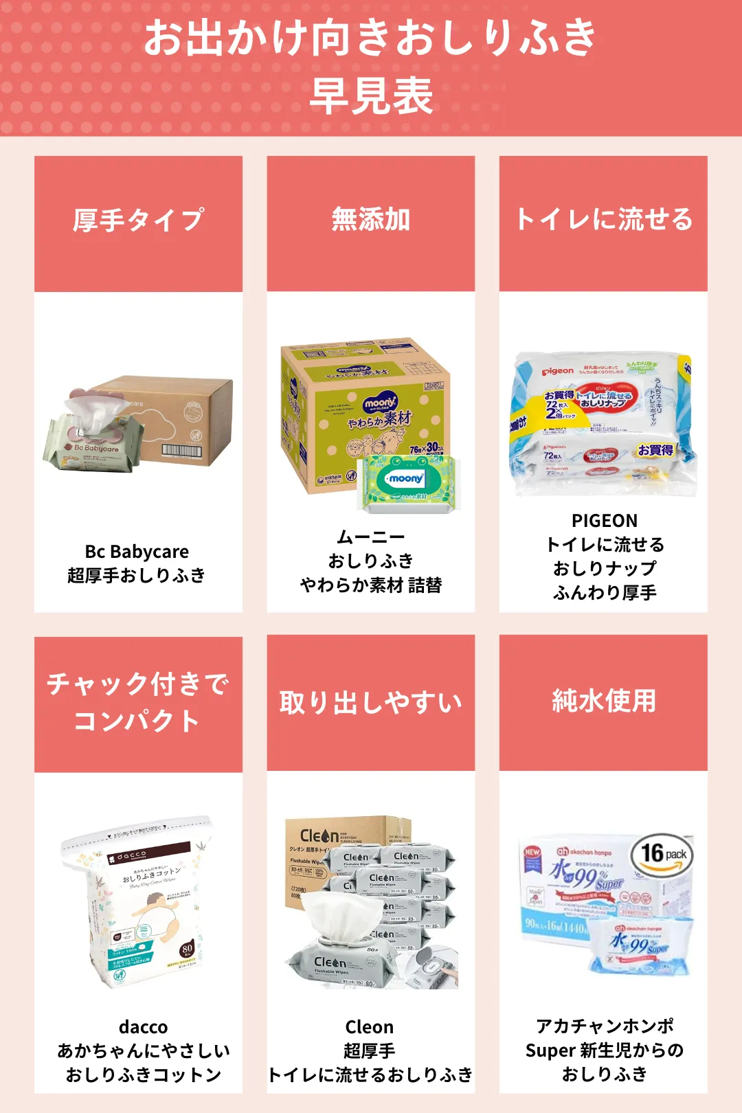 お出かけ用おしりふきは「何を重視するか」を明確にすることで、自分に合った一つが選べます。おしりふき選びでチェックすべきポイントは、ズバリ以下です。