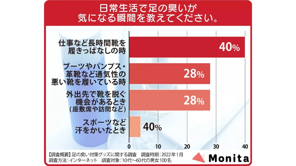 アンケートではまず、日常生活の中で足の臭いが特に気になる瞬間を調査しました。1位は「仕事など長時間靴を履きっぱなしのとき」で40%もの方が選んでいます。2位は「通気性の悪い靴を履いているとき」「外出先で靴を脱ぐとき」が各28%で同率でした。