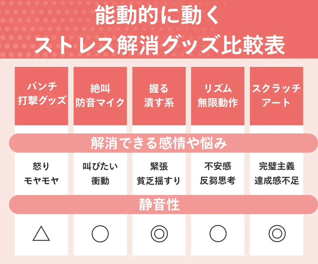 ストレス解消グッズは「何を重視するか」を明確にすることで、自分に合った一つが選べます。ストレス解消グッズ選びでチェックすべきポイントは、ズバリ以下です。