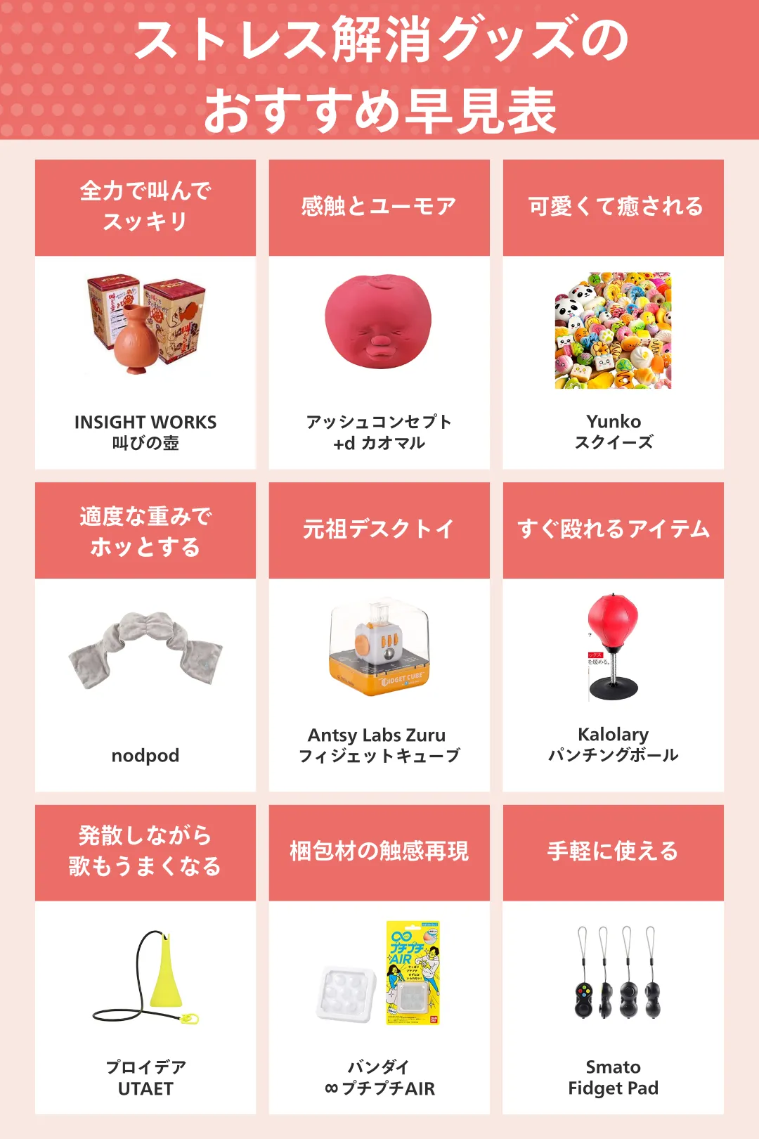ここまでさまざまなストレス解消グッズをご紹介してきました。ストレスは溜め込みすぎると病気の原因になる場合もあります。今回のランキングを参考に、ぜひお気に入りのストレス解消グッズを見つけてください。