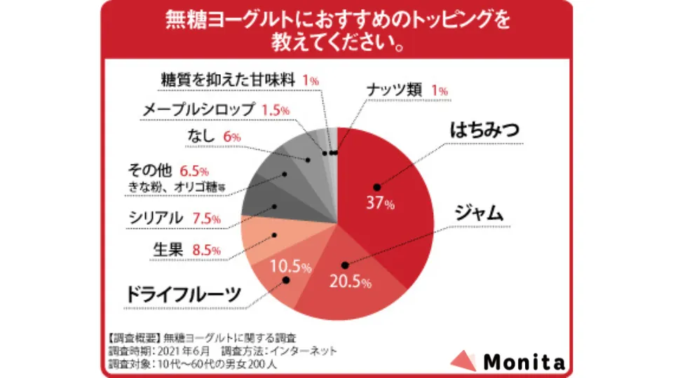 アンケートではおすすめの無糖ヨーグルトの食べ方もうかがいました。人気のトッピングははちみつ・ジャム・ドライフルーツになります。糖質に気をつけながらその日の気分で味付けを変えれば、無糖ヨーグルトを毎日の習慣に取り入れやすいです。
