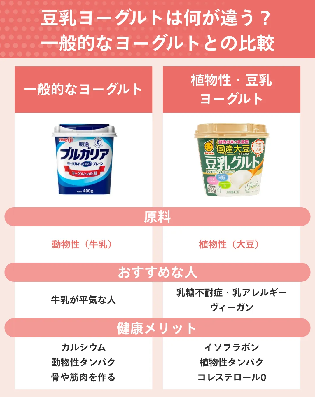 牛乳ではなく豆乳を植物性乳酸菌で発酵させた豆乳ヨーグルトは、乳製品を一切使用していないため、牛乳を飲むとお腹がゴロゴロする乳糖不耐症の方や、乳アレルギーを持つ方でも安心して食べられます。また、動物性食品を避けるヴィーガンやベジタリアンの方にとっても貴重な発酵食品です。大豆由来の植物性タンパク質に加え、女性ホルモンに似た働きをする大豆イソフラボンが豊富に含まれており、美容や健康を気遣う女性層から特に支持されています。