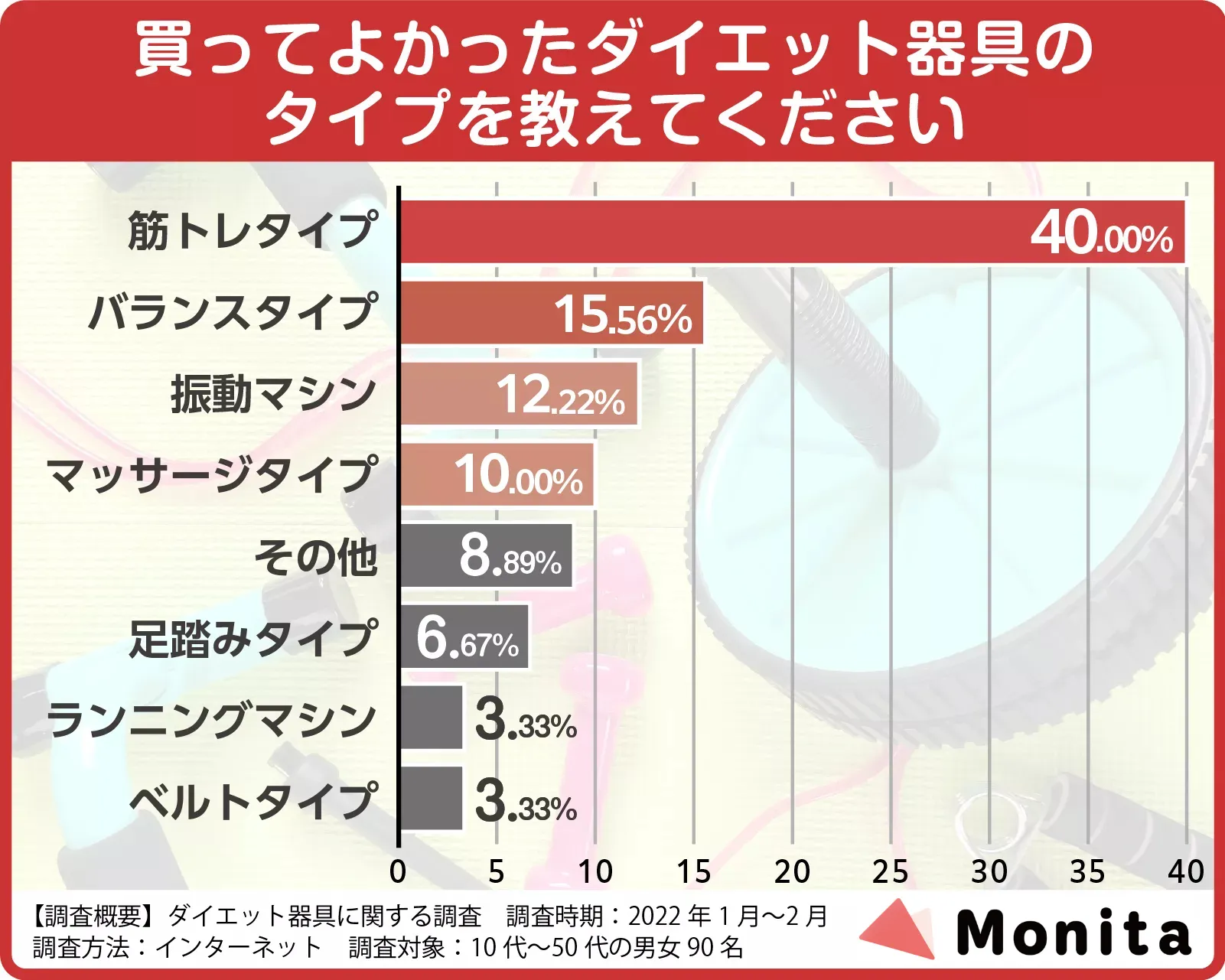 次に買ってよかったダイエット器具のタイプについてお伺いしました。その結果1位は「筋トレタイプ」で40%の票を獲得しました。ダイエット器具にはさまざまな運動に対応したものがあり、目的に合ったタイプを選ぶことがおすすめです。