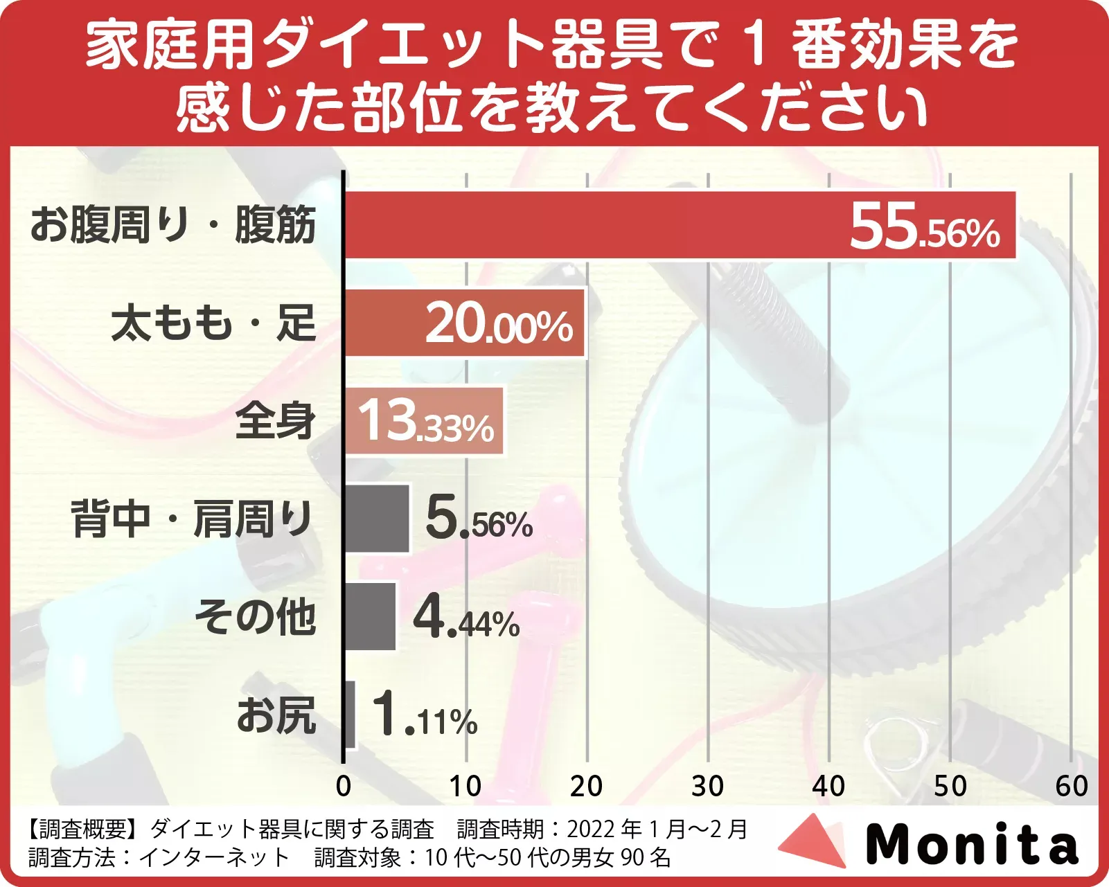 アンケートでは次に家庭用のダイエット器具で特に効果を感じた部位についてもお伺いしました。その結果、1位は半数以上の票を獲得した「お腹周り(腹筋)」、次いで2位は「太もも・足」で20%、3位は「全身」で約13%となりました。