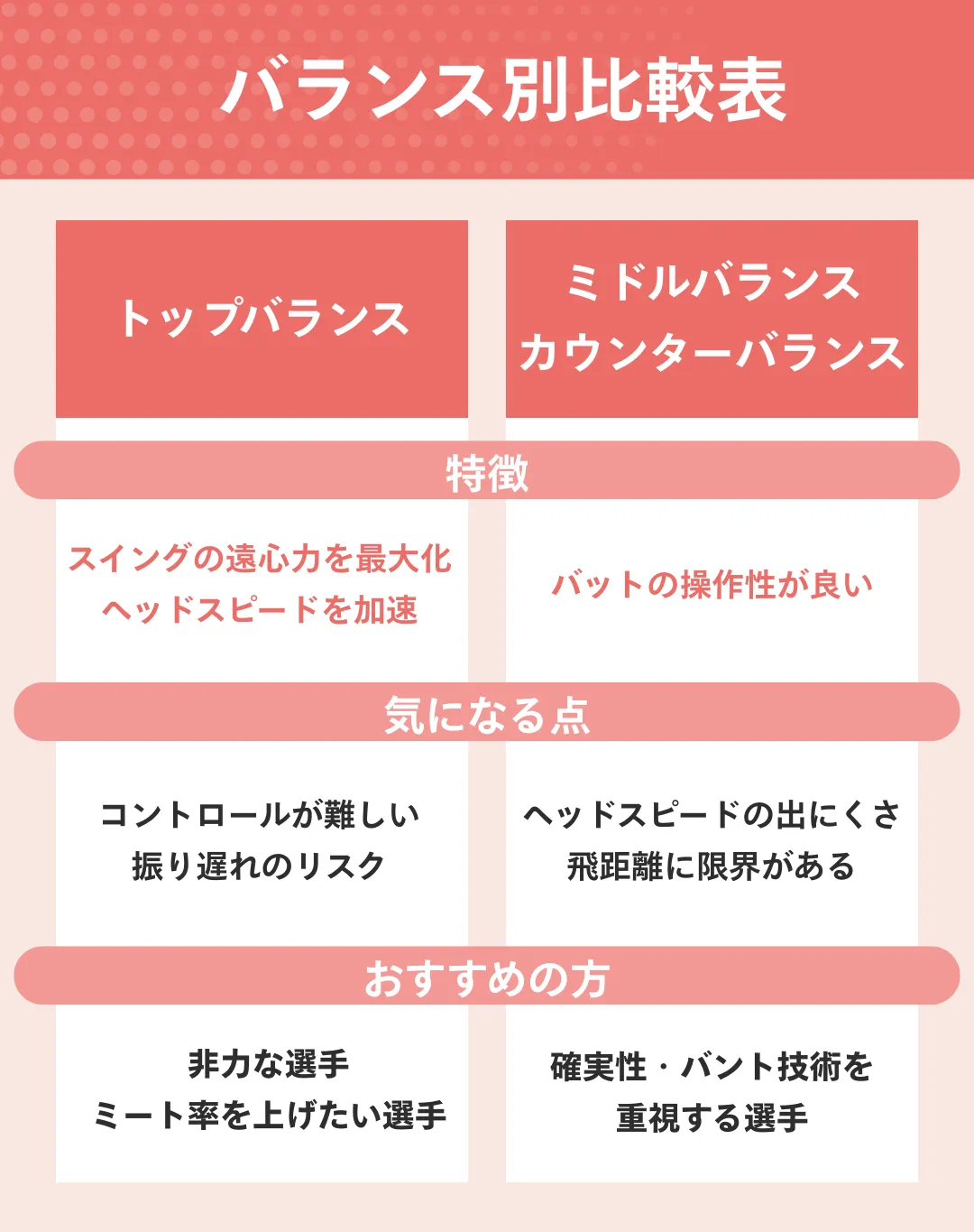 バットの重さを利用して振る感覚を身につけられますが、コントロールが難しくなるため、ある程度スイングフォームが固まっている選手が、長打力を磨くために選ぶバランスです。