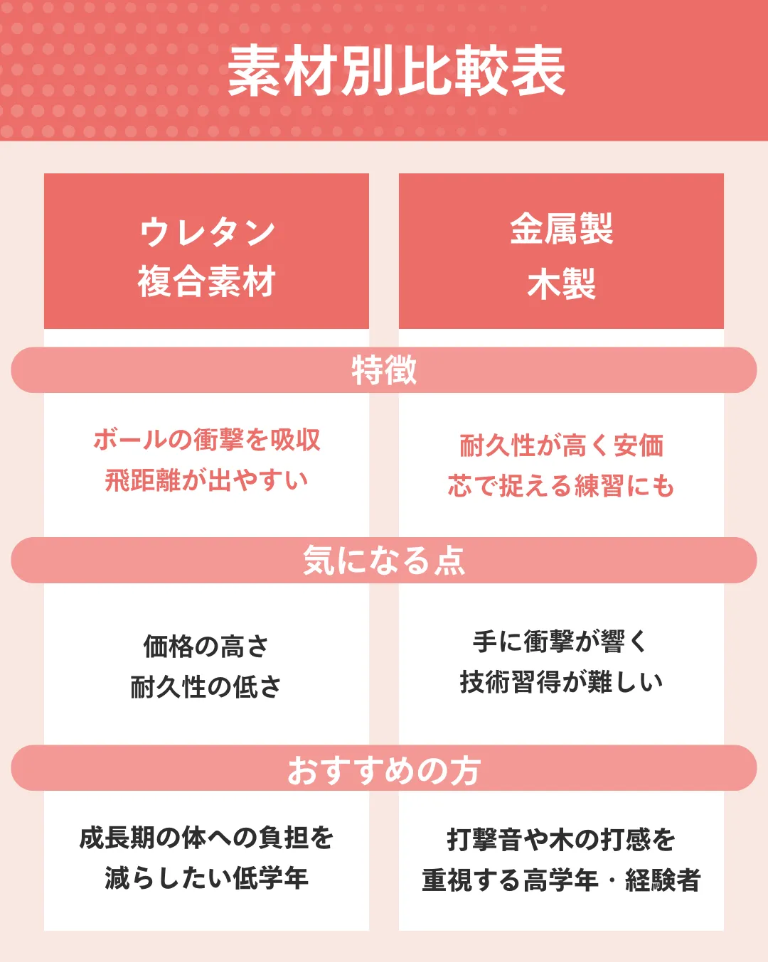 低学年や体に負担をかけたくない場合は、衝撃吸収性が高いウレタンなどの複合素材がおすすめです。打撃音や耐久性、価格を重視する高学年・経験者は金属製を、技術向上を追求するなら木製を選びましょう。