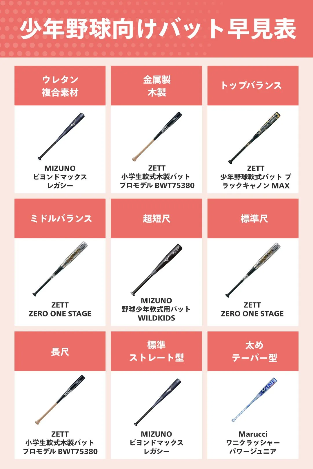 おすすめ少年野球向けバット早見表はこちら