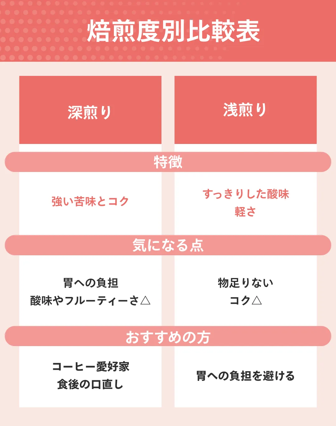 強い苦味やコクを求めるなら深煎りを、すっきりとした酸味や軽さを求めるなら浅煎りを選びましょう。焙煎度によって風味が大きく変わるため、好みの味を見つけることが重要です。