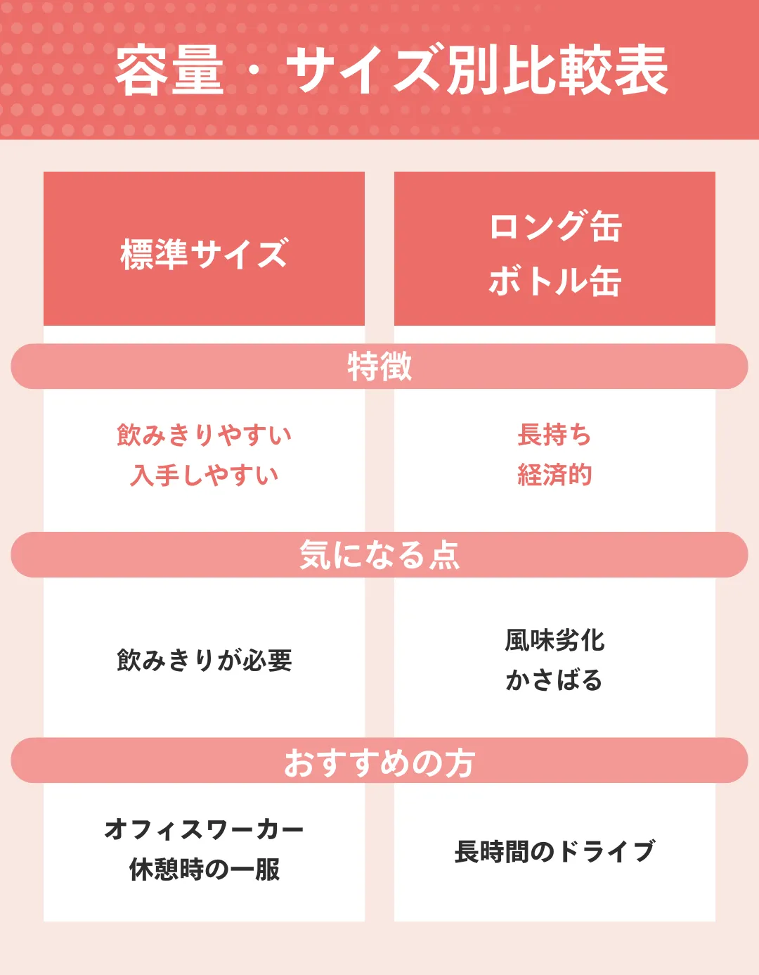 休憩時間の一服には標準缶、長時間のドライブや水分補給を兼ねるならロング缶やボトル缶がおすすめです。ボトル缶はキャップ付きで持ち運びにも便利で、衛生面を重視する方にも向いています。