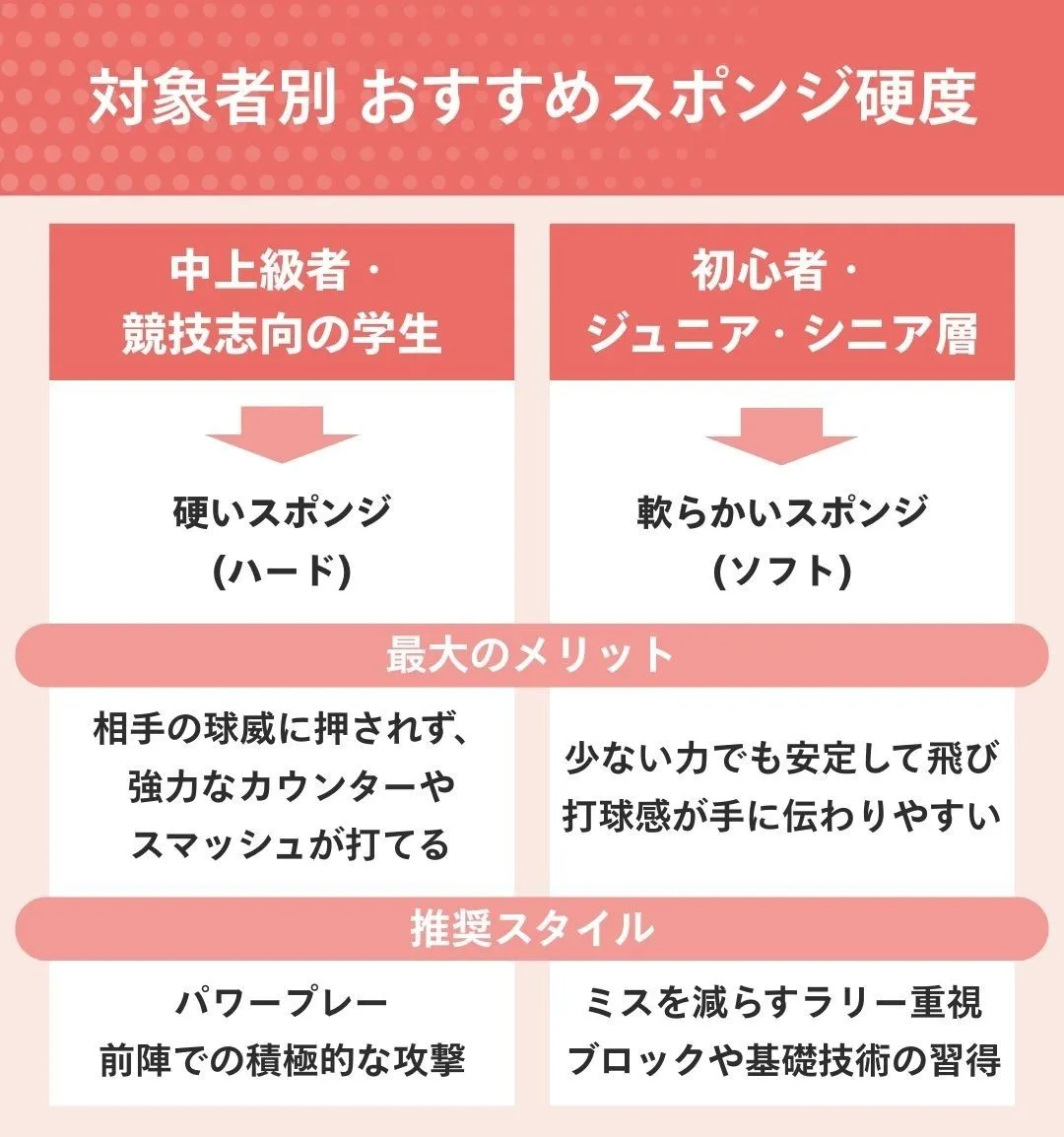 用具選びにおいて、スポンジの硬さは打球の弾道や威力、そして手元に伝わる感覚に直結する重要な要素です。硬度はメーカーごとに数値化されており、自身の筋力やスイングの速さに合わせて選択することが上達の近道となります。プレースタイルを決定づける基礎的な知識を深め、最適な硬さを見極める視点を持つことが大切です。