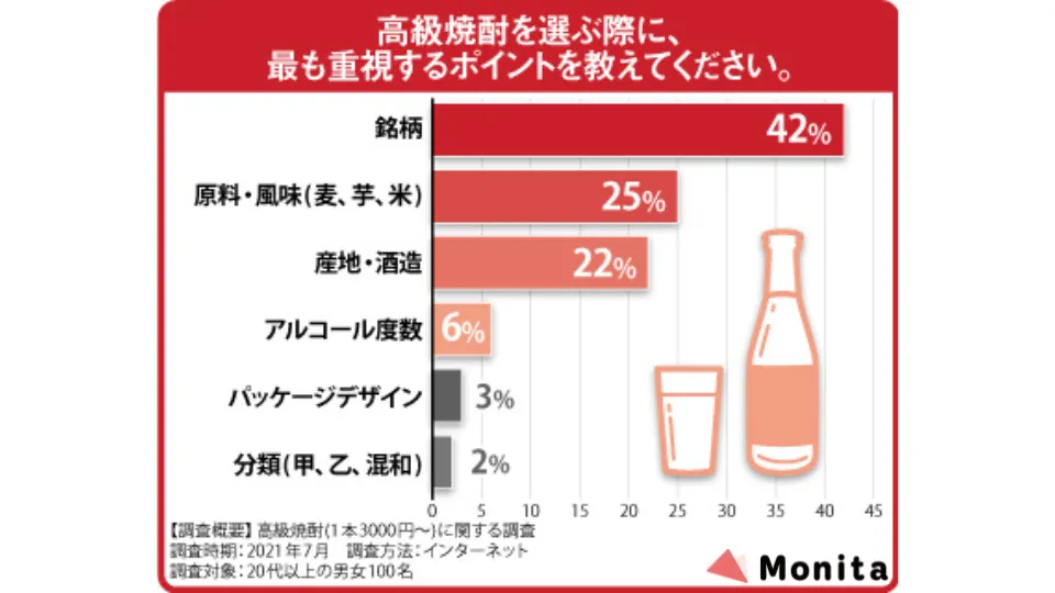 続いてアンケートでは高級焼酎の選び方について調査しました。その結果、