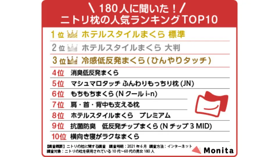 今回は実際にニトリの枕を使用している男女180人にアンケートを実施し調査結果を元に、ニトリの枕の人気おすすめランキングをご紹介します。枕の洗い方やテレビで紹介された枕もご紹介するので、購入を迷われている方はぜひ参考にしてください。