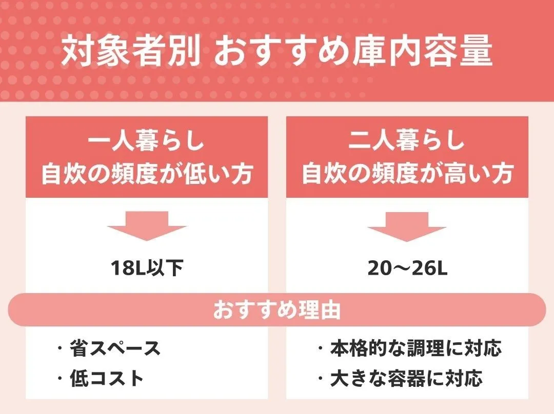 一度に調理できる量や、使用する容器のサイズは庫内容量によって決まります。ライフスタイルが単身なのか、あるいはパートナーとの二人暮らしなのかによって、最適な容量の基準は異なります。自分の食生活において、温め直しがメインなのか、本格的な調理を行うのかを見極めることで、過不足のないモデル選びが可能になります。