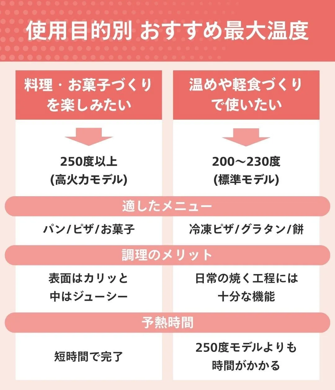 250度以上の高火力と予熱速度の関係については、本格的なパン作りやピザ、ローストビーフなどの調理を視野に入れているなら、最高温度が250度以上に達するモデルを選ぶのが賢明です。一般的なモデルは200度から230度程度が限界であることが多いですが、高火力モデルであれば予熱時間も短縮され、調理全体の効率が上がります。
