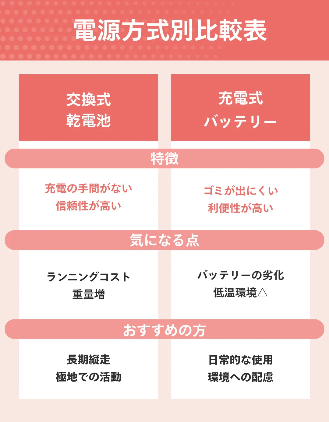 長期縦走や極地活動には交換式乾電池の信頼性を、日常使いや環境配慮にはランニングコストの低い充電式バッテリーを選ぶのが便利です。