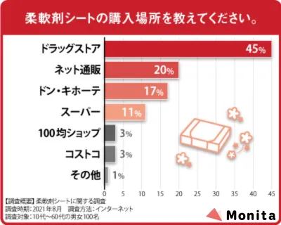 日頃、液体柔軟剤を使用している方のなかには、柔軟剤シートなんて見た経験がない方もいらっしゃるかもしれません。アンケートでは、実際に柔軟剤シートをご使用中の方に、購入場所を教えていただきました。