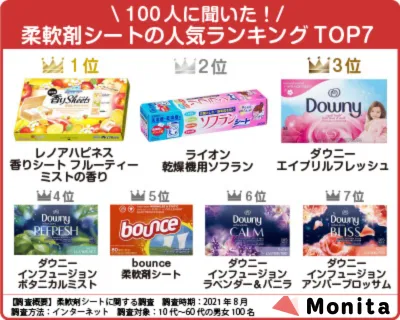今回は男女100名を対象におすすめの柔軟剤シートを調査しました。1番人気はレノアハピネス 香りシート フルーティーミストの香りです。柔軟剤シートの人気おすすめランキングをご紹介します。柔軟剤シートのデメリットや、乾燥機用柔軟剤がどこで売ってるかについても紹介するのでぜひ参考にしてください。