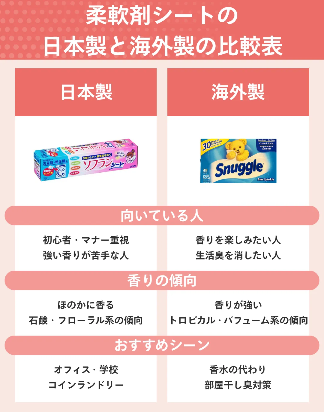柔軟剤シートは輸入品が多いため、海外らしい豊かな香りを楽しめるのも魅力です。