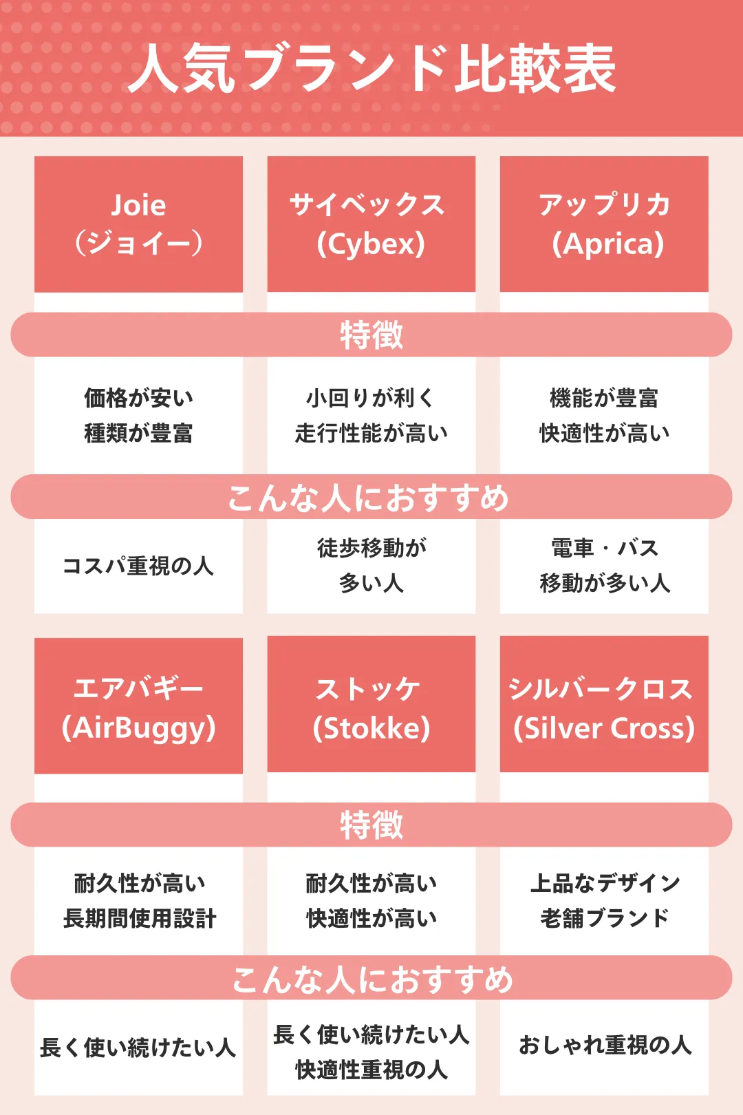 人気ブランドからベビーカーを選ぶ際は、自分に合ったタイプ・用途などで選ぶと迷いません。