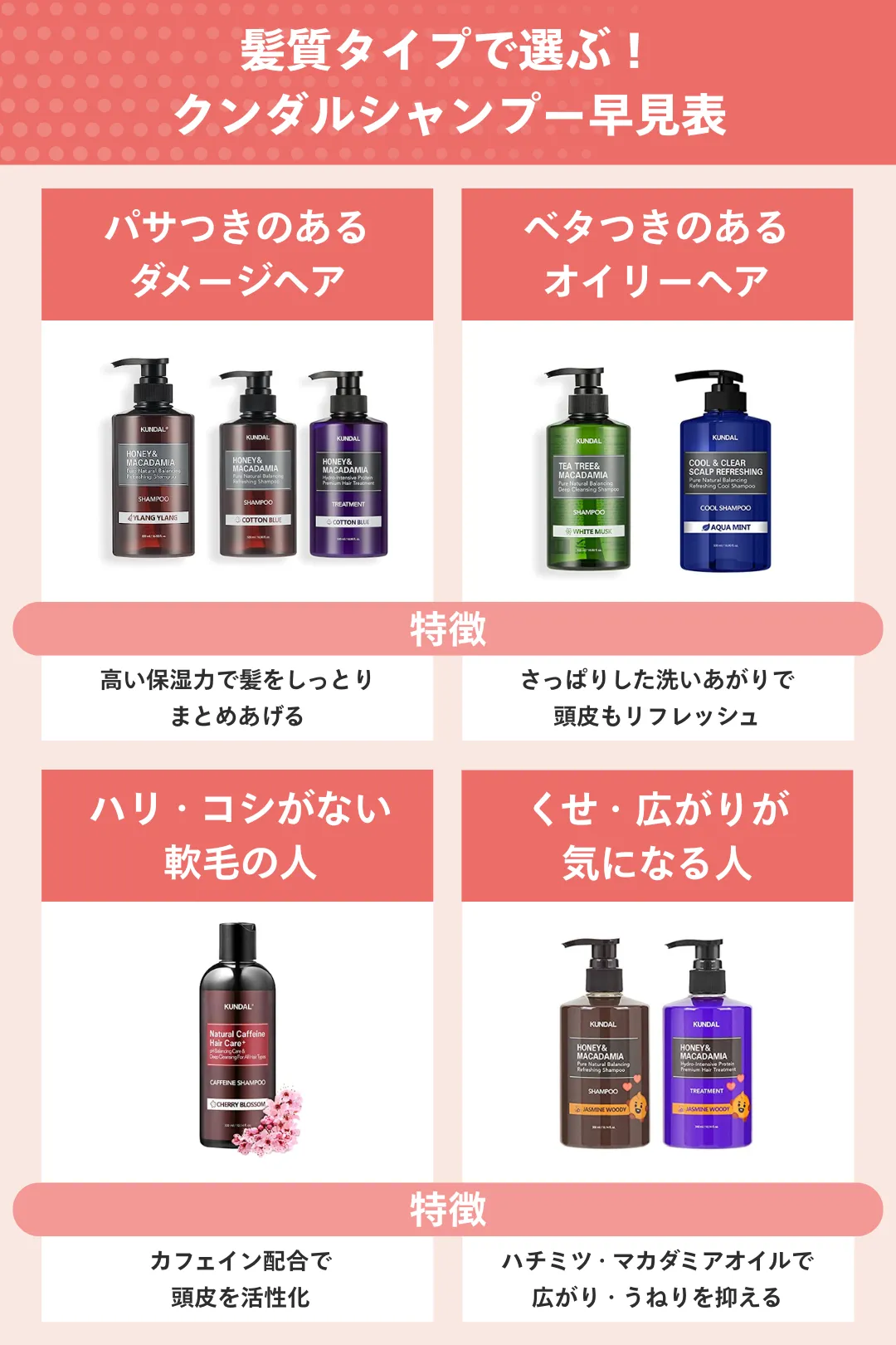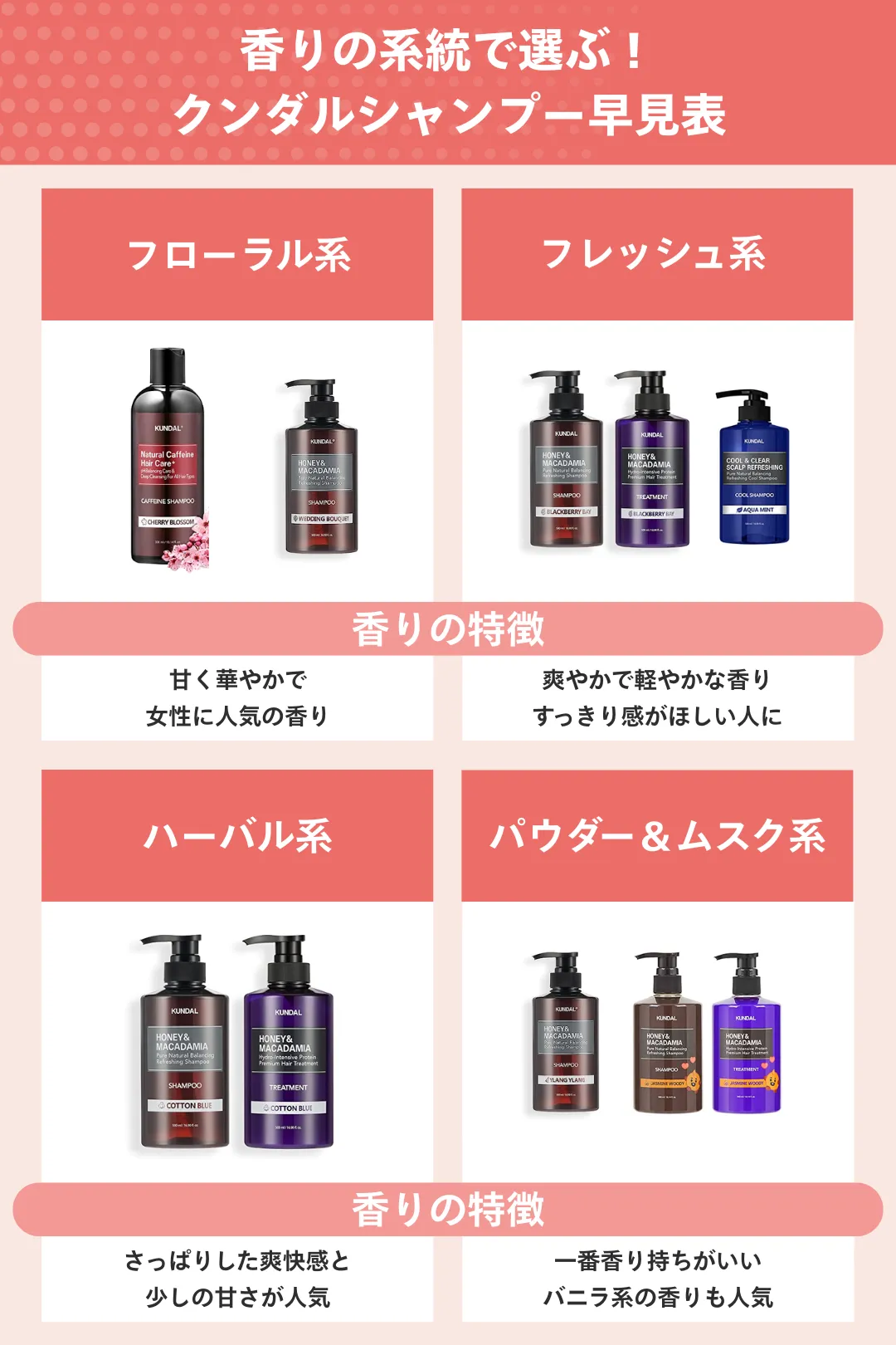 クンダルでは、フローラル系・ムスク系の香りのシャンプーを多くラインナップしています。花やバニラを連想するような、甘くて華やかな香りが好きな方におすすめです。