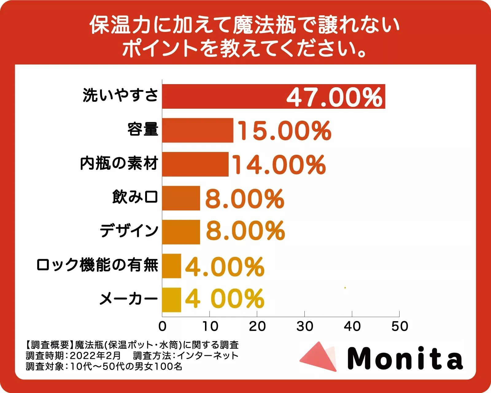アンケートでは、保温力のある魔法瓶を選ぶ際に重視するポイントについて質問しました。その結果、「洗いやすさ」を重視する方がおよそ半数にも上りました。