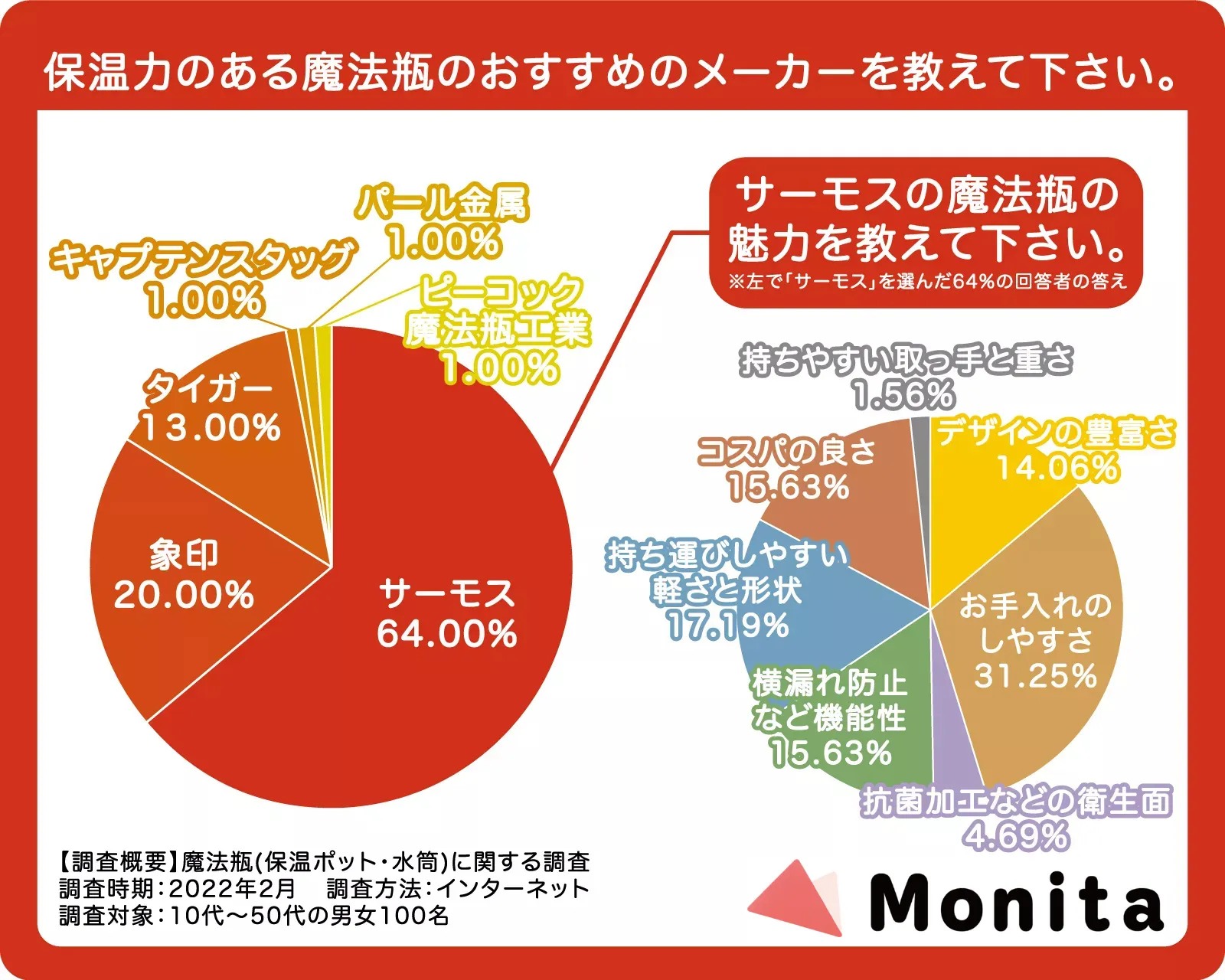 アンケートでは、魔法瓶のおすすめメーカーについても質問しました。その結果、約6割の方が「サーモス」と回答しています。サーモスの魔法瓶は、お手入れのしやすさ・持ち運びやすさ・コスパの良さで優れていると考えている方が多いと分かりました。