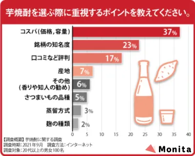 アンケートでは、本当にうまい芋焼酎を選ぶポイントとおすすめの飲み方を調査しました。最も重視されていたポイントは「コスト」で37%、続いて「銘柄の知名度」が23%、「口コミなどの評判」が17%との結果になりました。