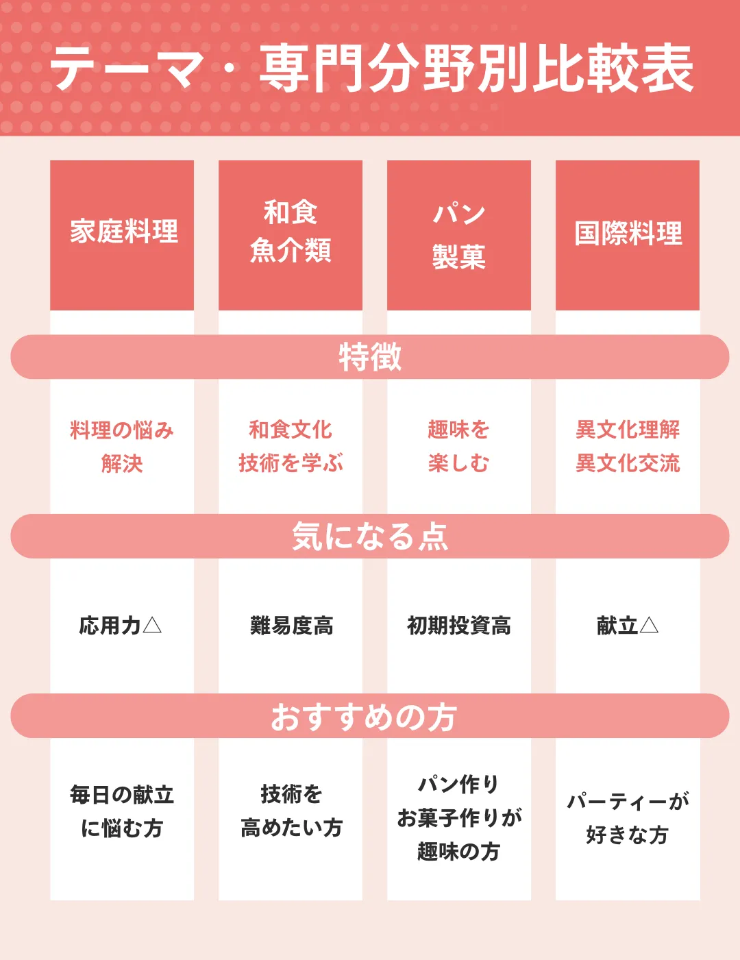 毎日の献立作りを効率化したいなら、家庭料理や時短・節約コースを、プロの技術や高度な知識を習得したいなら、和食・製菓などの専門分野特化型を選びましょう。