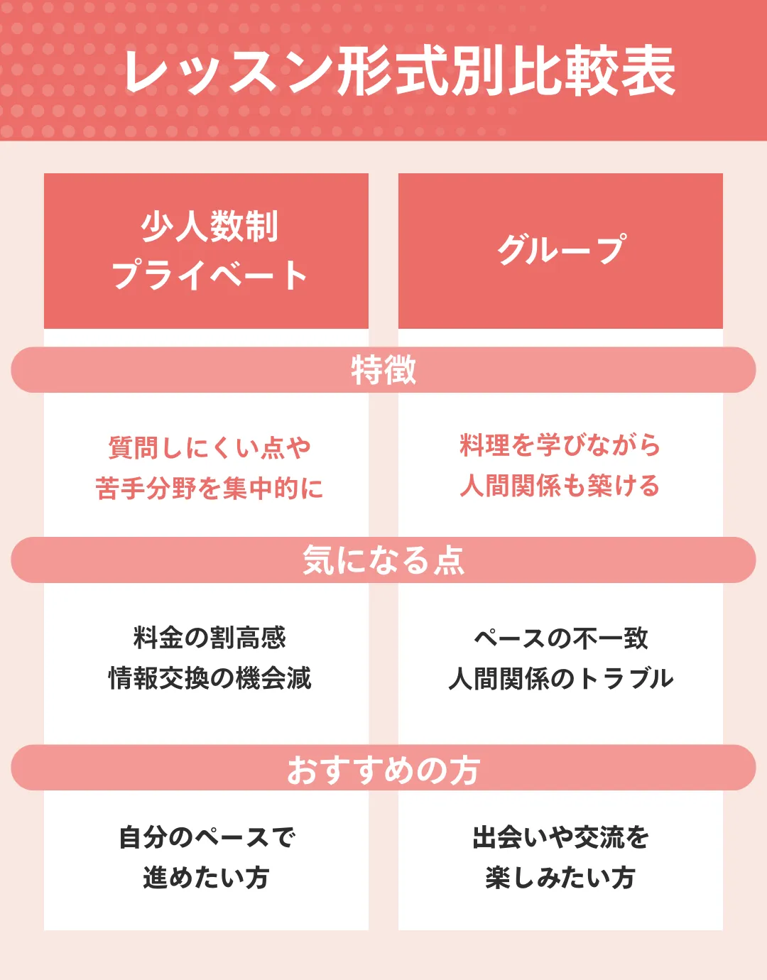 自分のペースで確実に技術を習得したいなら、講師と密に指導を受けられる少人数制やプライベートレッスンを選びましょう。交流や新しい仲間との出会いを楽しみたい単身者には、グループレッスンが最適です。