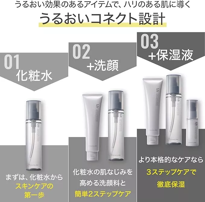 簡単に泡立つ濃密泡洗顔と、セットになっている化粧水と保湿液を顔全体に馴染ませる3ステップで簡単にケアが完了します。無香料でさっぱり、肌なじみもいいので、化粧品特有の香りやベタベタが苦手な方にもおすすめ。保湿をしっかりしてくれるので潤うモテ肌を目指せます。