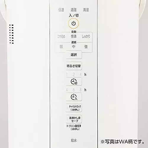 ホワイト1色のみの1色展開です。部屋の湿度を確認できる湿度モニターを搭載しており、低湿・適湿・高湿の3段階で湿度を表示します。また、大容量タンクのため弱運転で最長32時間の連続運転ができる点もポイントです。