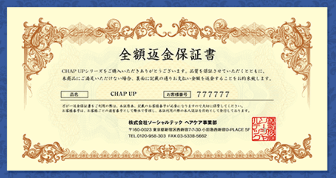 チャップアップはもし効果が出ないなどの理由で解約したい人のために、永久返金保証制度を設けており気軽に試せます。注意点としては、無期限の全額返金保証制度は定期便の初回購入のみ適用されることです。都度購入で初回購入した場合は30日間の返金保証になりますので、事前に把握しておきましょう。