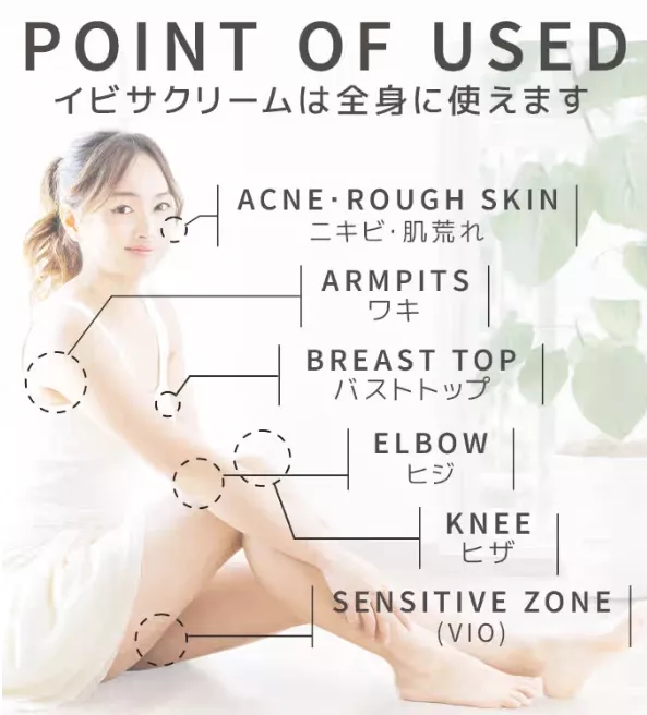 イビサクリームはデリケートゾーンに使用できるよう成分にこだわっているので、黒ずみ*が気になる全身に使用可能です。Iラインはもちろん、おしりや脇、バストトップにもおすすめです。