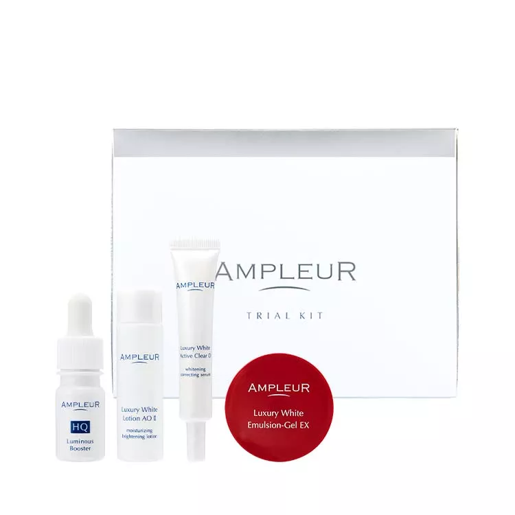 アンプルール ラグジュアリーホワイトトライアルキットは1週間分のお試しセットで、ルミナスHQブースター、ローションAOII、薬用アクティブクリアD、エマルジョンゲルEX、クリアコンセントレートHQショット(2回分)が入っています。