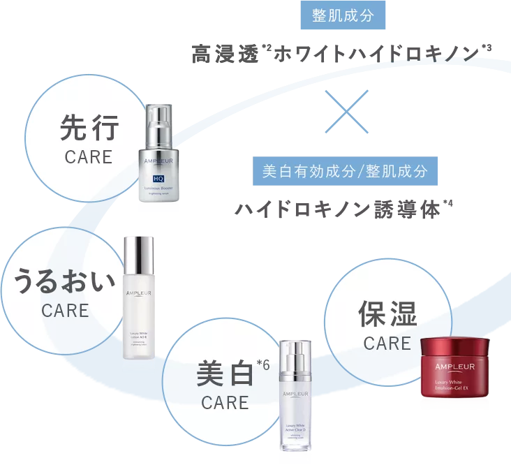 アンプルールは高浸透*¹ホワイトハイドロキノン*²と、ハイドロキノン誘導体*³を段階的に重ねることで、効率的なスキンケアパフォーマンスを実現しています。