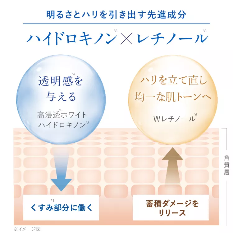 ハイドロキノンのほかにも、整肌成分であるレチノールはWで配合*¹されており、肌の健康に欠かせないビタミンAをしっかり補給できます。また、トリプルセラミド*²やトラネキサム酸といった、美容・有効成分が乾燥やハリ不足をケアします。
