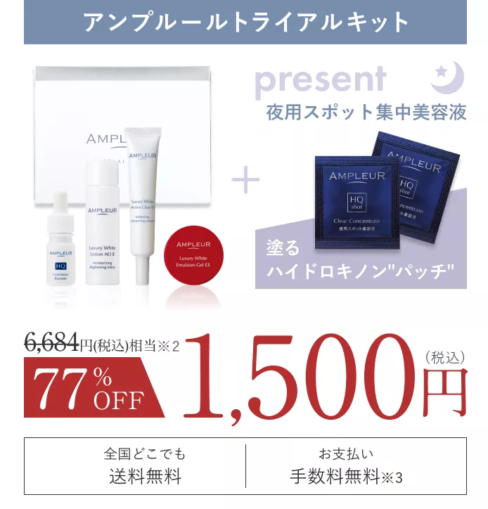 アンプルール ラグジュアリーホワイトが、自分の肌にあっているかどうか、使い心地が合っているかどうか確認してから購入したい方は、公式サイトで販売されているトライアルキットがおすすめです。6,684円相当のアイテムを、1,500円(税込)で購入できます。送料が無料なのも嬉しいですね。話題の集中美容液もお試しできます。