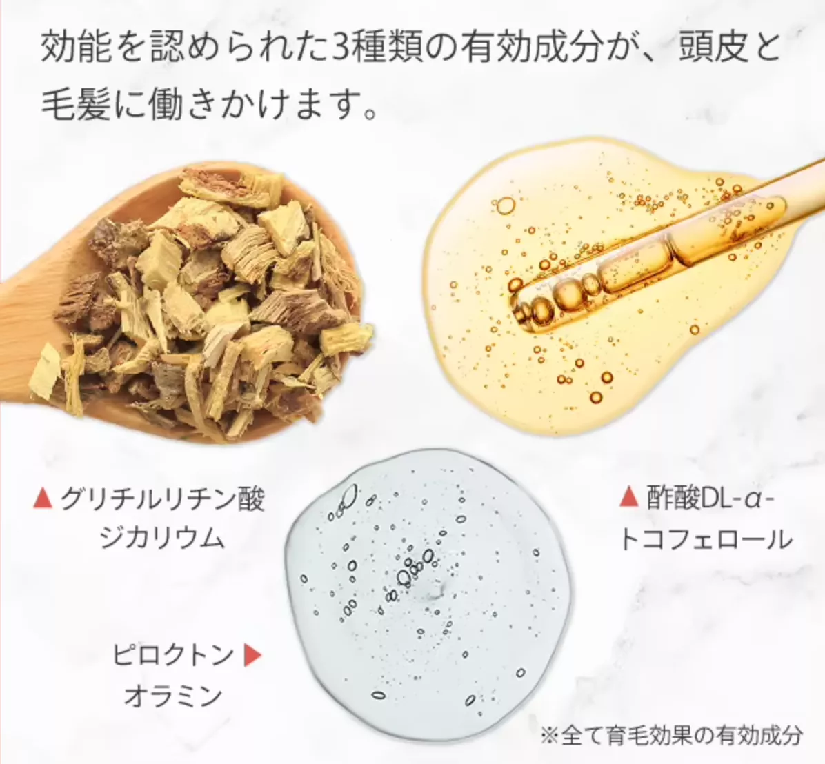 ※酢酸DL-α-トコフェロール、グリチルリチン酸ジカリウム、ピロクトンオラミン(全て育毛効果の有効成分)