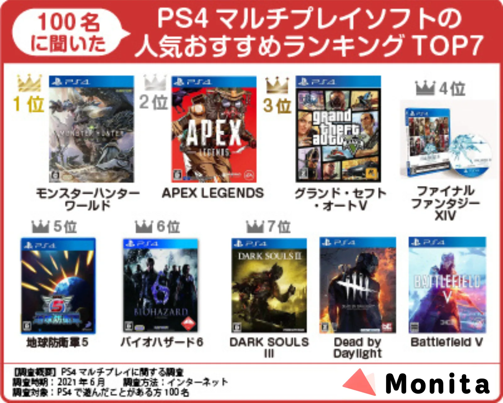 今回は、100人を対象にしたPS4マルチプレイソフトに関するアンケートでおすすめ作品を調査しました。マルチプレイとは何か気になる方や、男性でも女性でもみんなで遊べるプレステ4のゲームをお探しの方はぜひ参考にしてください。