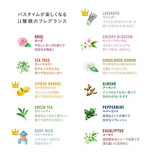 ローズはバラの香りがしっかり活かされていてリッチな気分になれます。使うとお風呂いっぱいにバラの香りが広がります。きつすぎないやわらかな香りで特に女性からの人気が高い商品です。