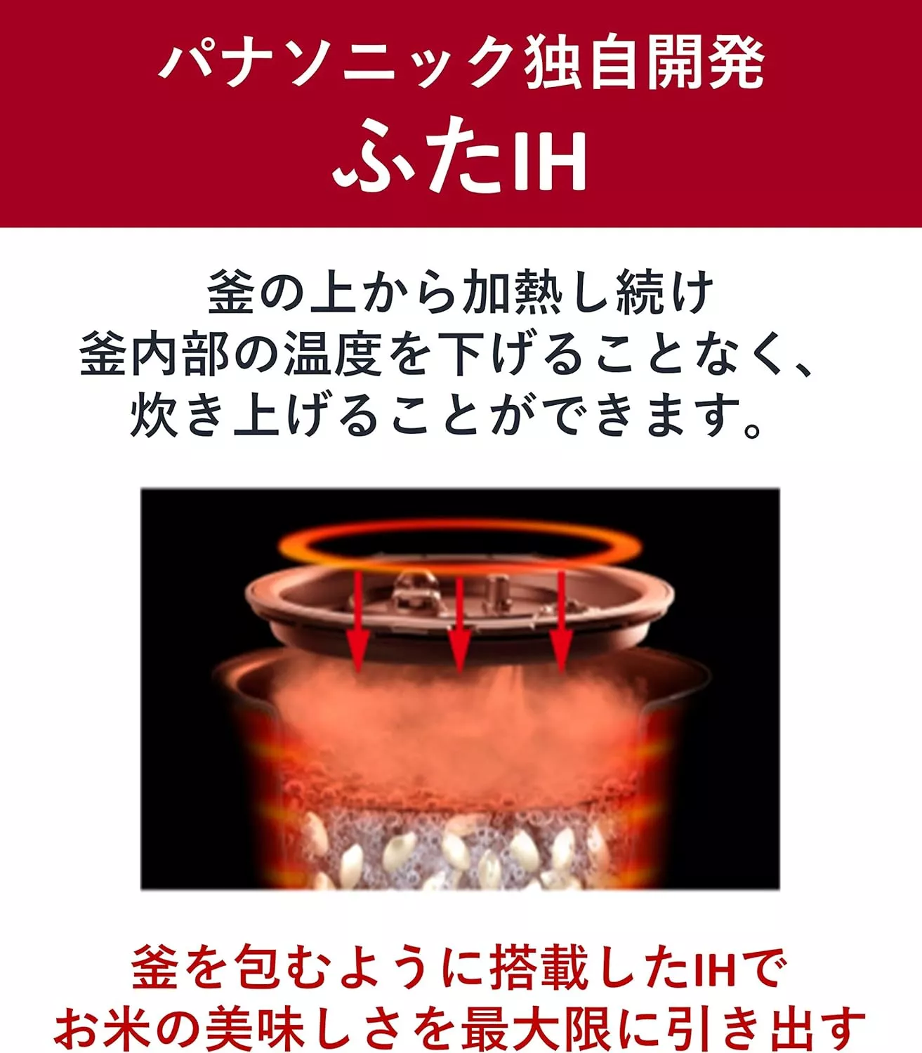 そのため爆発的な沸騰が起こり、お米をふっくら炊きあげるパナソニックだけの独自の機能を搭載しておりおすすめです。