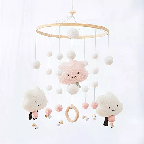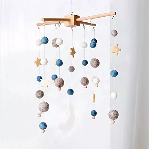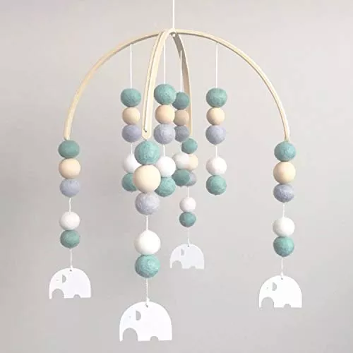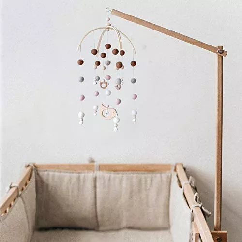 1つ1つ手作りの羊毛フェルトの飾りがナチュラルな北欧風ベッドメリーです。やわらかくカラフルな色合いに明るく軽い鈴の音がとてもシンプルで優しい雰囲気を作っています。派手な仕掛けはありませんが温かみのあるデザインが人気です。