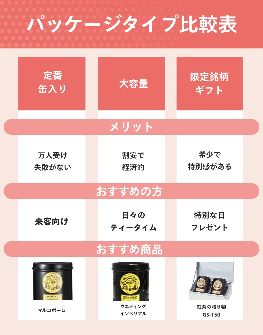 ブランドの象徴であるマルコ ポーロは、万人受けする華やかな香りで失敗がありません。黒い缶は高級感があり、贈答品として最適です。