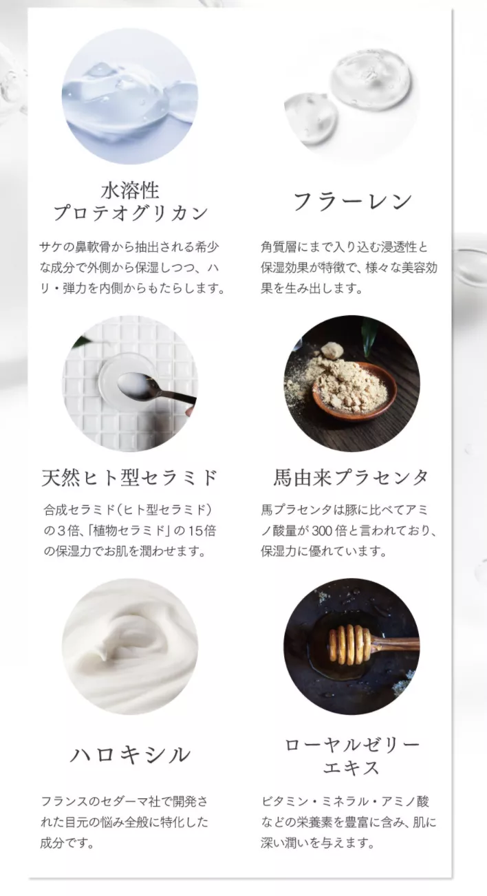 こぼれるほどに目元に潤いを与える目元ケア成分をたっぷりと配合。「水溶性プロテオグリカン」「フラーレン」「天然ヒト型セラミド」「馬由来プラセンタ」「ハロキシル」「ローヤルゼリーエキス」といった美容保湿成分が、ぎゅっと1本に濃縮されています。