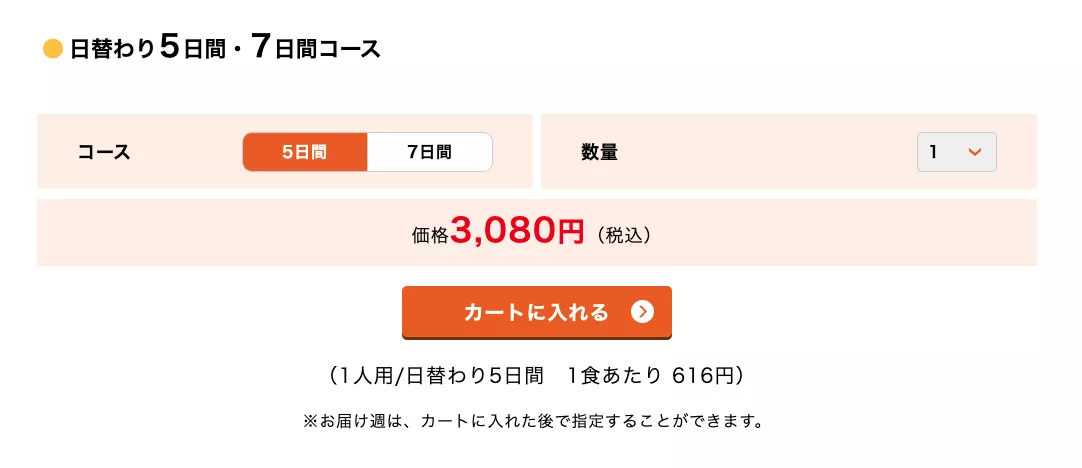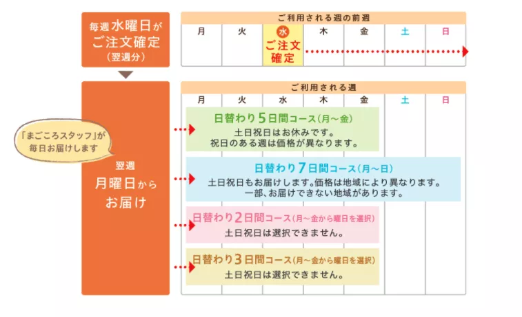 | お届け日 | 月曜日から金曜日まで(週2日~) | 都合に合わせてまとめて |