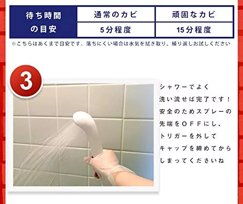 表面のみの軽いカビであれば、スプレーして30分程度で洗い流してみてください。しつこいカビや一度で落ちなかったカビは1~2時間放置し、しっかり洗い流すとキレイになります。放置時間は目安なので、カビの様子を見ながら調節してみてください。