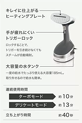 アクセススチーム プラス DT8100J0 ティファール(T-fal) | 楽天ヤフー | 蒸気の作用でシワ伸ばしだけでなく除菌も叶う | 13.0×14.1×28.3cm | 1,220g | 3m | 40秒 | |