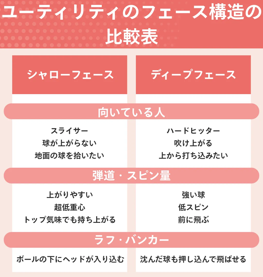 フェースの厚みが薄く、横に長い形状です。重心が極めて低くなるため、地面にあるボールを拾い上げる性能に優れています。トップ気味に当たっても球が持ち上がるため、フェアウェイバンカーやラフからでも脱出しやすいのがメリットです。