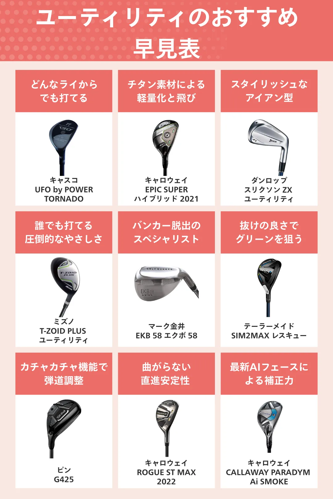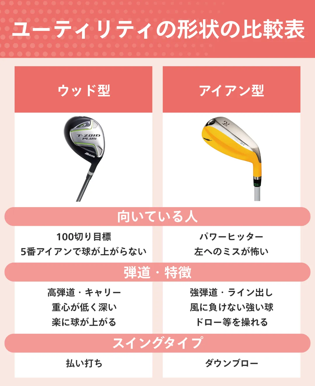ユーティリティ(UT)は3番~5番より、打つやさしさ・ボールの上がりやすさ魅力です。ウッド型とアイアン型の2種類があり、ミスショットの多いロングアイアンに替わって飛距離も稼いでスコアメイクしてくれます。